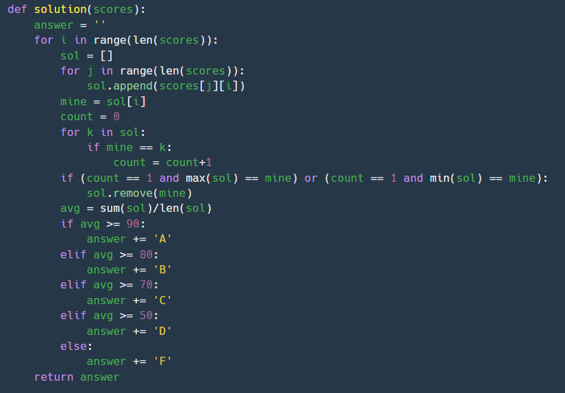 2차원 배열로 입력이 주어지는데 각 요소가 한 사람이 다른 사람에게 준 점수들이라서 새로 배열(sol)을 하나 만든 다음에 각 사람이 받은 점수를 배열에 추가하는 방식을 선택했다. A가 받은 점수를 일단 모두 배열에 추가해주는데 이때 자기 자신이 준 점수는 따로 변수에 저장해주었다. 그리고 sol을 한 바퀴 돌면서 해당 점수가 단 하나인지를 체크해주었다. 이 두 값을 가지고 최대 혹은 최소이면서 유일한 값이라면 그 값을 sol에서 삭제했다. 그리고 평균 구한 다음에 학점 추가했다.