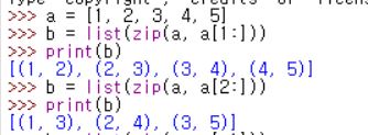 이런 식으로 zip(list, list[1:]) 이렇게 작성을 해주면 리스트 속의 요소를 i, i+1 이렇게 묶어준다! zip(list, list[2:]) 이렇게 쓰면 i, i+2 이렇게 묶어줌. 그래서 좀더 코드를 간단하게 쓸 수 있다. 사실 zip이 어떻게 동작하는지 몰라서 효율성이 어떻게 좋아지는지는 잘 모르겠다. 효율성 지키기는 너무 어렵다...