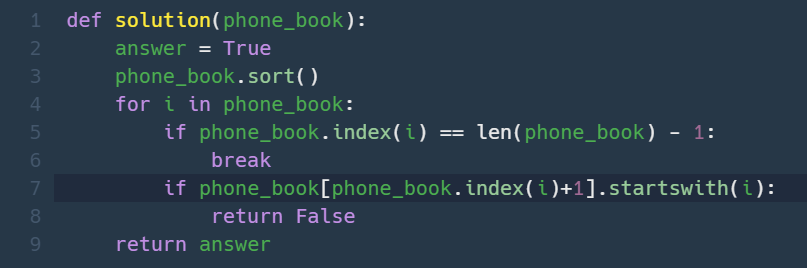 원래는 startswith을 안 쓰고 in을 썼는데 생각해보니 in을 사용하면 접두사가 아니고 그냥 포함만 돼있어도 False로 판단을 해버려서 만약 in을 쓰려면 i+1번째 숫자를 i와 같은 길이만큼 자른 다음에 in이나 ==으로 판별해줘야할 것 같다.