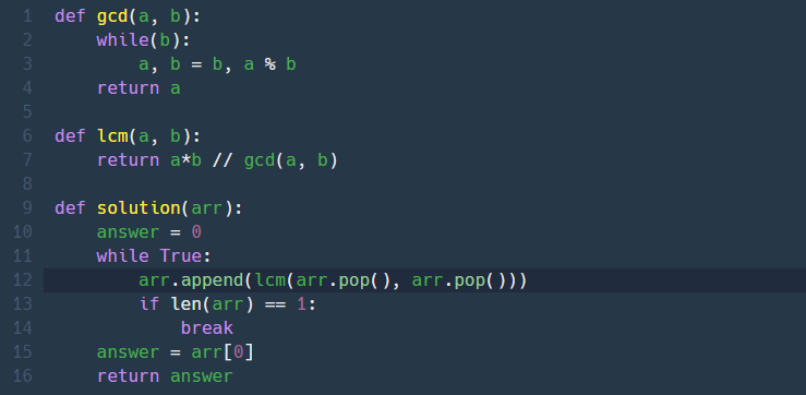 최대공약수랑 최소공배수 식을 이용하면 쉽게 풀 수 있다. 유클리드 호제법을 사용한 풀이인데 전에 했던 것처럼 연습할 겸 math 라이브러리 쓰지 않고 그냥 작성했다. arr의 길이가 1이 될 때까지 lcm을 반복해서 찾아주면서 주어진 모든 수의 최소공배수를 구할 수 있다.