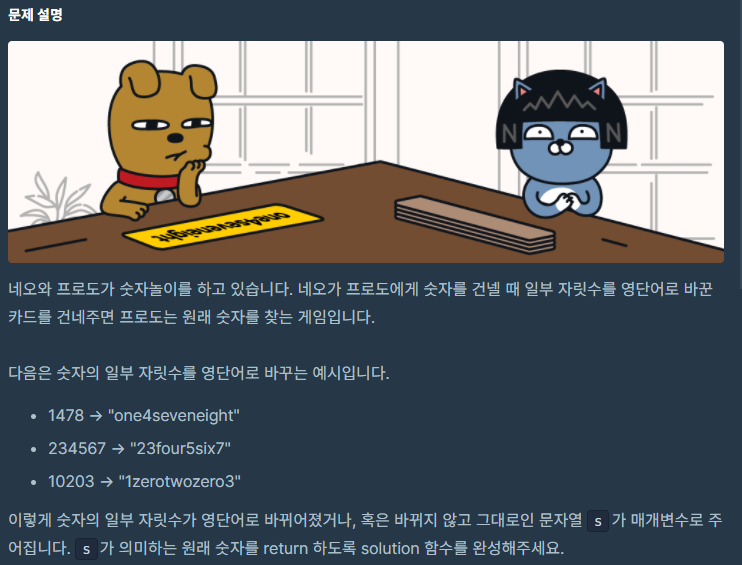 네오와 프로도가 숫자놀이를 하고 있습니다. 네오가 프로도에게 숫자를 건넬 때 일부 자릿수를 영단어로 바꾼 카드를 건네주면 프로도는 원래 숫자를 찾는 게임입니다. 다음은 숫자의 일부 자