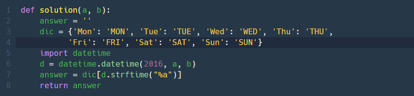 이렇게 풀어도 되나 싶지만 어쨌든 풀면 되지. 요즘 자꾸 매일 푸는 걸 까먹는다.. datetime이랑 딕셔너리로 풀기