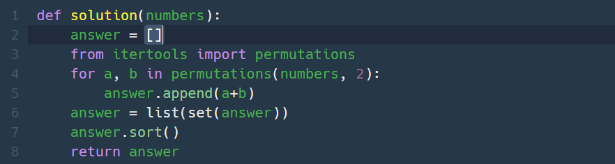 정수 배열 numbers가 주어집니다. numbers에서 서로 다른 인덱스에 있는 두 개의 수를 뽑아 더해서 만들 수 있는 모든 수를 배열에 오름차순으로 담아 return 하도록 solution 함수를 완성해주세요. 제한